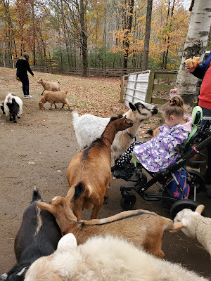 This morning, we went over to Smiling Hill Farm for a tractor ride and to see the animals. We made reservations for the tractor ride (which is completely accessible with a ramp!), so we were the only ones on it and didn't have to wear masks. Although she loved the ride (particularly when we went up and down hills), a certain little turd wouldn't smile whenever I took out the camera! Daddy had to make faces at her!